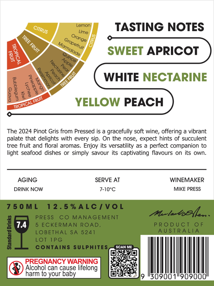 “New label, same household name! Mike Press is back with a Pinot Grigio masquerading as Gris that captures the zest and crunch of a cool season in the Adelaide Hills in nashi pear, granny smith apple and grapefuit, structured by energetic acidity and bite. Drink 2024-2025″